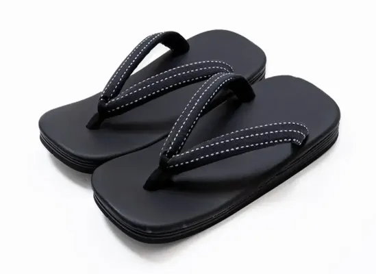 ・五枚底構造で贅沢な厚みと重厚感を実現・厚みがもたらす安定感で長時間の着用も疲れにくい・刺子織の鼻緒が控えめな上品さを演出・綿100%の鼻緒で肌あたりが柔らかく快適・圧縮EVAを使用した合成底で軽量かつ耐久性に優れる・合成皮革(ポリウレタン)の表地で手入れが簡単