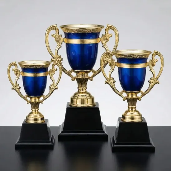 落ち着いたネイビーブルーにゴールドを組み合わせた、上品で重厚な印象のCP-206カップ。クラシックな飾り装飾を施したデザインは、式典のステージや授賞の場に上質な雰囲気をもたらします。軽量設計で扱いやすく、スポーツ表彰から社内アワードまで幅広く対応します。